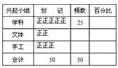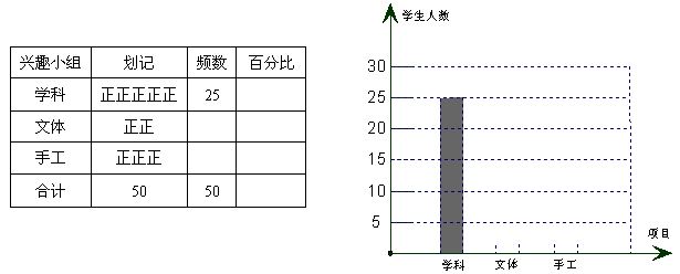 某中学计划对本校七年级10个班的480名学生按“学科”、“文体”、“手工”三个项目安排课外兴趣小组,小组小明从每个班中随机抽取5名学生进行问卷调查,并将统计结果制成如下所示的表和图,