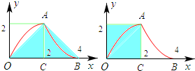 我想出来了,是4;连接OA、OB,作AC⊥OB于C,OC=BC=AC=2,△OAB是等腰直角三角形,又因为分段的两部分对应的二次项系数的绝对值相等,所以这两段抛物线的形状相同,它们自变量的取值长度也相等,都是2,所以分割的部经过剪切,旋转,平移可以填补,就象图中这样,原来的阴影部分面积等于等腰Rt△OAB,也等于那个正方形的面积,是4