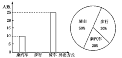 下面两图是某班在“五·一”黄金周期间全体同学以乘汽车、步行、骑车外出方式旅游的人数分布直方图和扇形分布图。从这两个分布图所提供的数字,请你回答下列问题: