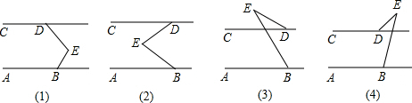 (1)已知AB∥CD,下列各图中的∠ABE、∠E、∠CDE三个角之间各有什么关系?填入下列括号内,并选择一个你自己喜欢的图加以说明理由.