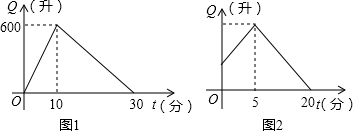 甲,乙两个形状完全相同的容器都装有大小分别相同的一个进水管和一个出水管,两容器单位时间进、出的水量各自都是一定的.已知甲容器单开进水管第10分钟把空容器注满;然后同时打开进、出水管,第30分钟可把甲容器的水放完,甲容器中的水量Q(升)随时间t(分)变化的图象如图1所示.而乙容器内原有一部分水,先打开进水管5分钟,再打开出水管,进、出水管同时开放,第20分钟把容器中的水放完,乙容器中的水量Q(升)随时间t(分)变化的图象如图2所示,则乙容器内原有水________升.
