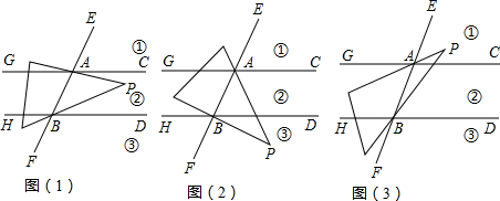 如图(1)直线GC∥HD,EF交CG、HD于A、B,三条直线把EF右侧的平面分成①、②、③三个区域,(规定:直线上各点不属于任何区域).将一个透明的直角三角尺放置在该图中,使得30°角(即∠P)的两边分别经过点A、B,当点P落在某个区域时,连接PA、PB,得到∠PBD、∠PAC两个角.