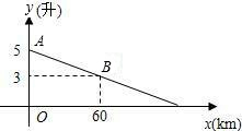 某摩托车的油箱最多可存油5升,行驶时油箱内的余油量y(升)与行驶的路程x(km)成一次函数关系,其图象如图.