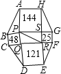 如图,已知八边形ABCDEFGH中4个正方形的面积分别为25,144,48,121个平方单位,PR=13(单位),则该八边形的面积=________平方单位.