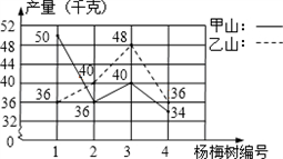 王大伯几年前承包了甲、乙两片荒山,各栽 100 棵杨梅树. 成活 98%,现已结果,经济效益初步显现.为了分析收成情况,他分别从两山上随意各采摘了4 棵树上的杨梅,每棵的产量如折线绕计图所示.