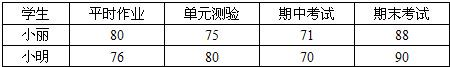 老师计算学生的学期总评成绩时按照如下的标准:平时作业占10%,单元测验占30%,期中考试占25%,期末考试占35%,小丽和小明的成绩如下表所示: