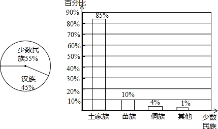 (2007•恩施州)恩施是我国最年轻的少数民族自治州,总人口数约为385万(2005年普查统计),除汉族外,还居住着土家族、苗族、侗族、白族、蒙古族、回族等28个少数民族.下面是2005年恩施州各民族人口统计图(如图).