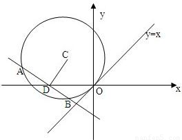 已知圆心在第二象限,半径为的圆C与直线y=x相切于坐标原点O,过点D(-3,0)作直线与圆C相交于A,B两点,且|DA|=|DB|。