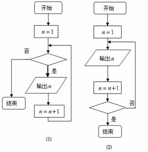 如图(1)、(2),它们都表示输出所有立方小于1000的正整数的程序框图,那么应分别补充的条件为