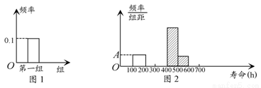 12分)某工厂对200个电子元件的使用寿命进行检查,按照使用寿命(单位:h),可以把这批电子元件分成第一组[100,200],第二组(200,300],第三组(300,400],第四组(400,500],第五组(500,600],第六组(600,700].由于工作中不慎将部分数据丢失,现有以下部分图表: