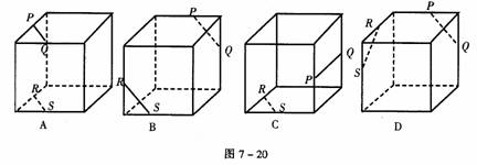 1.如图7-20,点P、Q、R、S分别在正方体的四条棱上,并且是所在棱的中点,则直线PQ与RS是异面直线的一个图是( )