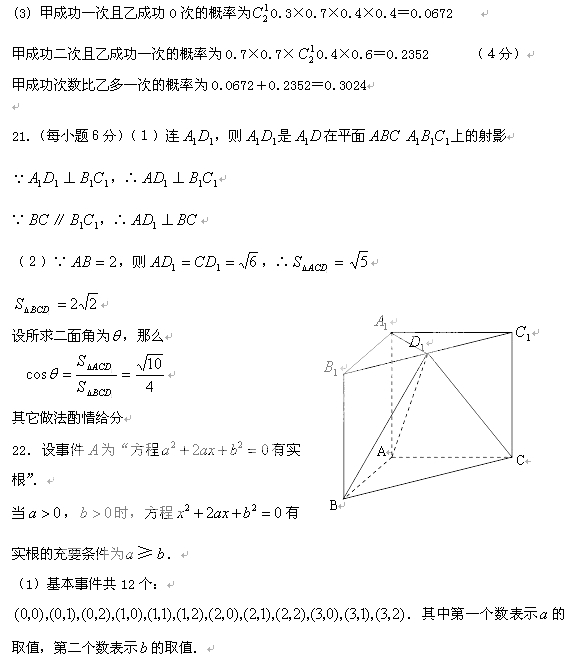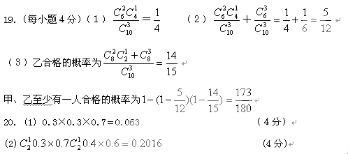 19.(本题满分12分)甲、乙两人参加一次英语口语考试,已知在备选的10道试题中,甲能答对其中的6题,乙能答对其中的8题。规定每次考试都从备选题中随机抽出3题进行测试,至少答对2题才算合格。