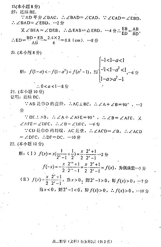 已知:如图,△ABC中,AD是∠BAC的平分线,延长AD交△ABC的外接圆于点E,若AB=6cm,BC=2.4cm,BE=2cm,求DE的长。