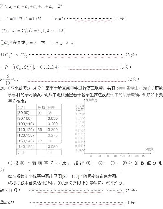 (本小题满分14分)某市十所重点中学进行高三联考,共有5000名考生,为了了解数学学科的学习情况,现从中随机抽出若干名学生在这次测试中的数学成绩,制成如下频率分布表: