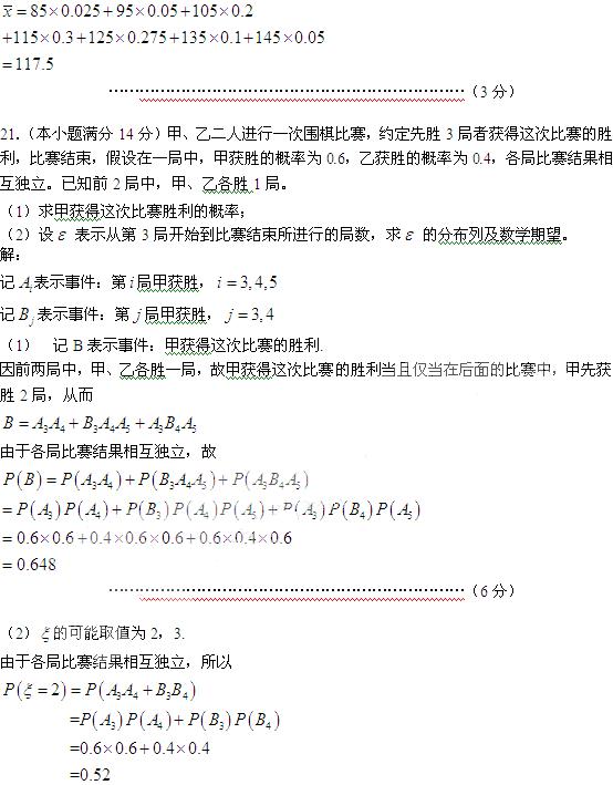 21.(本小题满分14分)甲、乙二人进行一次围棋比赛,约定先胜3局者获得这次比赛的胜利,比赛结束,假设在一局中,甲获胜的概率为0.6,乙获胜的概率为0.4,各局比赛结果相互独立。已知前2局中,甲、乙各胜1局。