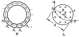 正负电子对撞机的最后部分的简化示意图如图甲所示(俯视图),位于水平面内的粗实线所示的圆环形真空管道是正、负电子做圆运动的“容器”,经过加速器加速后的正、负电子被分别引入该管道时,具有相等的速率v,它们沿着管道向相反的方向运动.在管道内控制它们转弯的是一系列圆形电磁铁,即图中的A1、A2、A3……An共有n个,均匀分布在整个圆环上,每个电磁铁内的磁场都是磁感应强度相同的匀强磁场,并且方向竖直向下,磁场区域的直径为d,改变电磁铁内电流的大小,就可改变磁场的磁感应强度,从而改变电子偏转的角度.经过精确的调整,首先实现电子在环形管道中沿图甲中粗虚线所示的轨迹运动,这时电子经过每个电磁场区域时射入点和射出点都是电磁场区域的同一条直径的两端,如图所示.这就为进一步实现正、负电子的对撞作好了准备.