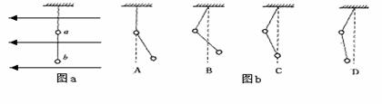 21.用两根长度相等的细线系住两质量相等,电量分别为+3q和-q的小球a、b。若在该面内加一水平向左的匀强电场E(如图a所示),则平衡后的状态为图b中的
