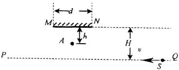 32.(16分)宽度为d的平面镜MN立于水平地面上,在平面镜的正前方的A点处(A点距平面镜M、N点等距离),有一人面对平面镜站在水平地面上,A点距镜面h远。在平面镜的前方与镜面平行的直线PQ上有一点光源S,从远处以速度v沿直线QP运动,如图所示。已知直线PQ与镜面相距H(H>h)远。