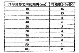33、将一支黑藻放在水中,如图所示,计算藻枝放出的气泡数以进行的光合作用的测定,改变灯与烧杯的距离行的测定,结果如表。