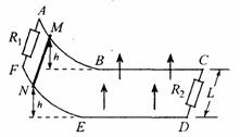 24.(18分)如图所示,足够长的金属导轨ABC和FED,二者相互平行且相距为L,其中AB、FE是光滑弧形导轨,BC、ED是水平放置的粗糙直导轨,在矩形区域BCDE内有竖直向上的匀强磁场,磁感应强度为B,金属棒MN质量为m、电阻为r,它与水平导轨间的动摩擦因数为μ,导轨上A与F、C与D之间分别接有电阻R1、R2,且R1= R2=r,其余电阻忽略不计。现将金属棒MN从弧形导轨上离水平部分高为h处由静止释放,最后棒在导轨水平部分上前进了距离s后静止。(金属棒MN在通过轨道B、E交接处时不考虑能量损失,金属棒MN始终与两导轨垂直,重力加速度为g=10m/s2)