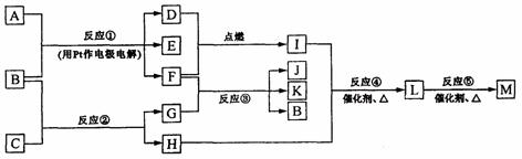 27.(16分)下图转化关系中的物质均为中学化学学过的物质。已知:A的焰色以应呈黄色;G是一种白色物质,微溶液于水;常温下,D、F均为气态单质,H、I为气态化合物;M是一种合成树脂,常用于制备塑料和合成纤维。