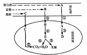 30.I.(14分)人体物质代谢的部分过程如图所示,其中A-E表示有关物质,①-⑦表示有关生理过程,请分析后回答下列问题