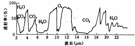 2.下图所示是大气中红外光透射率的光谱特性(横坐标是频率,纵坐标是能穿透大气的程度),试说明大气中的CO2吸收红外线的频率范围?
