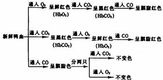 向三只盛有新鲜鸭血(先加入体K2C2O3溶液作抗凝剂,再用水稀释三倍)的试管中分别通入O2、CO2、CO,可观察到如下现象: