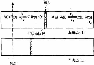 在一个容积固定的绝热透明反应器中,有一可左右滑动的密封导热隔板,当提起一下销钉,两侧分别进行如图所示的可逆反应。