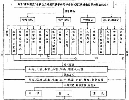 本题以“库尔斯克”号潜艇沉入海底这一重大事件设立情景,符合综合试题联系社会实际的命题要求,试题真实全面地模拟现实,要求学生对事物的整体结构和发展变化进行多角度、多层次的分析,所涉及的知识以多样性、复杂性和综合性呈现出来,考查学生运用多学科知识综合分析的能力和解决实际问题的能力。本题的具体的“解题建模”见下图: