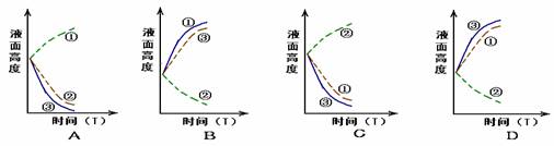请回答:下列曲线图中能够正确显示①、②、③三个小袋上端细玻璃管内液面可能变化的是--------------------------( )