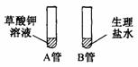 第一步:在A、B试管中分别加入等剂量的草酸钾溶液和生理盐水(见下图).
