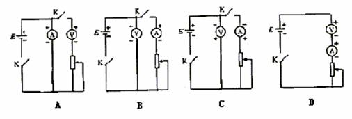36.可用理想电压表V、理想电流表A、变阻器R以及电键K和导线等器材来测量某一电源E的电动势和内阻。下面给出了四个电路图,图中+、--代表电源的正、负极和电表的正负接线柱。正确的电路图是 ( )