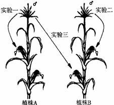 (21分)玉米是一种雌雄同株的植物,通常其顶部开雄花,下部开雌花。在一个育种实验中,选取A、B两棵植株进行了如图所示的三组实验: