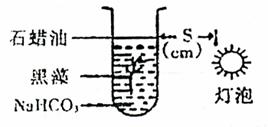23.(15分)为检测光质(不同波长的光)对水生黑藻光合作用强度的影响,现提供下述材料:红、绿、白三种颜色的40瓦的灯泡数个、试管数只、黑藻、PH试纸、石蜡油、NaHCO3溶液。请严格按照所给材料完成下面的试验设计并回答有关问题:实验开始步骤:在温度为20℃环境,按图组装实验装置,