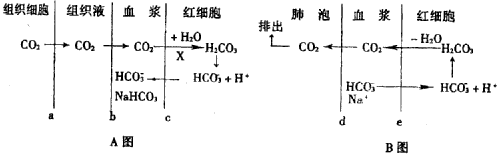 (3)下面A、B两图表示人体内CO2在血液中运输的部分原理及过程,其中A图表示血液从组织细胞中接受CO2;B图表示CO2从血液进入肺泡排出体外。问: