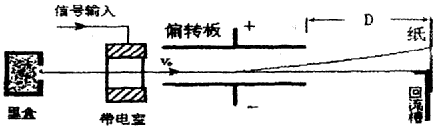 设偏板板长L=1.6×10-2m,两板间的距离为:5.0×10-3m,偏转板的右端距纸的距离D=3.2×10-2m。若一个墨汁微滴的质量为m=1.6×10-10kg以V0=20m/s的初速度垂直于电场方向进入偏转电场,两偏转板间的电压U=8.0×103V,若墨汁微滴打到纸上点距原射入方向的距离是Y=2.0×10-3m。求:(1)这个墨汁微滴通过带电室后带的电量是多少?(不计空气阻力和重力,可以认为偏转电场只局限在平行板电容器内部,忽略边缘电场的不均匀性。)(2)为了使纸上的字体放大,问如何调节U和D?