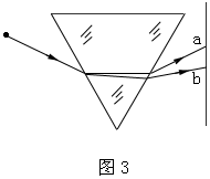 17.如图3所示,从点光源S发出的一细束白光以一定的角度入射到三棱镜的表面,经过三棱镜的折射后发生色散现象,在光屏的ab间形成一条彩色光带。下面的说法中正确的是 ( )