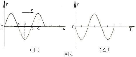 18.一列沿x轴正向传播的横波在某时刻的波形图如图4甲所示。a、b、c、d为介质中沿波的传播方向上四个质点的平衡位置,若从该时刻开始计时,则图4乙是下面哪个质点在经过3个周期后的振动图象? ( )