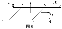 21.如图6所示,两根相互平行、间距为L的金属轨道MN和PQ固定在水平面内,轨道所在空间存在竖直向上的匀强磁场,磁感强度为B。在该轨道上垂直轨道方向放置两根金属杆ab和cd,它们的电阻分别为R1和R2,质量分别为m1和m2。开始时两金属杆静止在轨道上。某一时刻ab杆受到瞬间水平向右冲量作用,以初速度v0沿轨道滑动,这个瞬间cd杆的速度仍可视为零。已知金属杆ab和cd在轨道上滑动时所受到的摩擦力可忽略不计,金属轨道足够长且电阻不计,金属杆与轨道接触良好。以下说法中正确的是 ( )