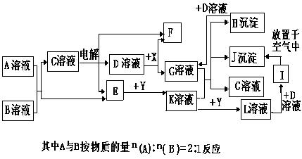 Ⅰ、(14分)下图中A~L分别表示反应中的一种常见物质,E、F在通常状况下是气体单质,其中E为刺激性气味的气体,X、Y是常见的固态单质,参加反应的水及生成的水在图中已略去。 B溶液的焰色反应为紫色。填写下列空白: