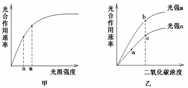 图甲表示A植物光合作用速率受光照强度影响的变化曲线。图乙表示A植物光合作用速率在不同光照强度环境下,光和速率受CO2浓度影响的变化曲线。a点与c点相比较,c点时叶肉细胞中C3的含量;b点与c点相比较,b点时叶肉细胞中C5的含量分别有什么变化