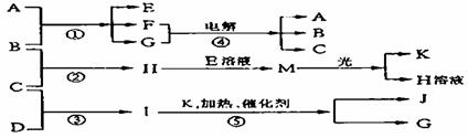 28.(16分)物质A由离子键和共价键构成的化合物.B、C、D、K都是气单质,反应①-⑤都是用于工业生产的反应,各有关物质(均由短周期元素组成,其它无关物质已略去)之间的相互反应转化关系如下图所示;