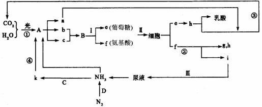 已知A、B、C、D代表生物,且A为植物,B为动物;a-k代表物质;①、②、③、④表示生理过程;I、Ⅱ、Ⅲ表示系统。