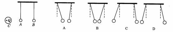 8.如图2所示,A、B为两个用绝缘细线悬挂起来的质量相同的带电介质小球,左边放一个带正电的球C时,两悬线都保持竖直方向(两线长度相同).若把C球移走,两球没有发生接触,那么右面四个图中,哪个图可以正确表示A、B两球的位置( )