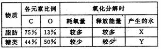 9.根据下表分析相同质量的脂肪和糖类在氧化分解时的差异,以下说法错误的是