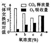 如图表示某植物的非绿色器官在氧浓度为a、b、c、d时,CO2释放量和O2吸收量的变化。下列相关叙述正确的是