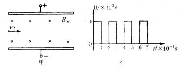 ,两板间加有垂直纸面向里、磁感强度B=1.25T的匀强磁场,两板上加有如图乙所示的电压(板间电场可视为匀强电场)。当