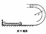 25.(20分)如图所示,竖直固定的内壁光滑的半圆弯管与水平管和光滑水平地面相切,管的半径为R,小球A、B由轻弹簧相连,质量均为2m,开始时,A球靠在墙边,A、B处于静止状态。小球C的质量为m,现C以某一初速度由水平管进入弯管,然后,与B正碰,碰后速度相同,但不粘连,最后,C球恰能返回水平管道。求: