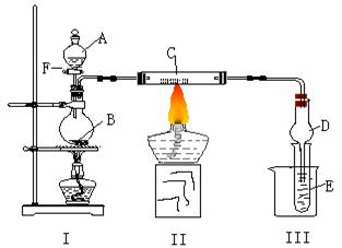 ⑵若I处酒精灯不加热, B、C仍是实验(1)中原物质,实验中也观察到C中黑色固体逐渐变红,同时可观察到E中溶液先形成沉淀,然后沉淀溶解,并有一种无色无味的气体逸出,当溶液恰好澄清时,关闭F,然后往烧杯中加入热水,静止一会,观察到III中试管壁也出现了光亮的银镜,则A是 ,E中是 与葡萄糖的混合液(写化学式)。请写出反应管C中所发生反应的方程式: 。仪器D在此实验中的作用是 。